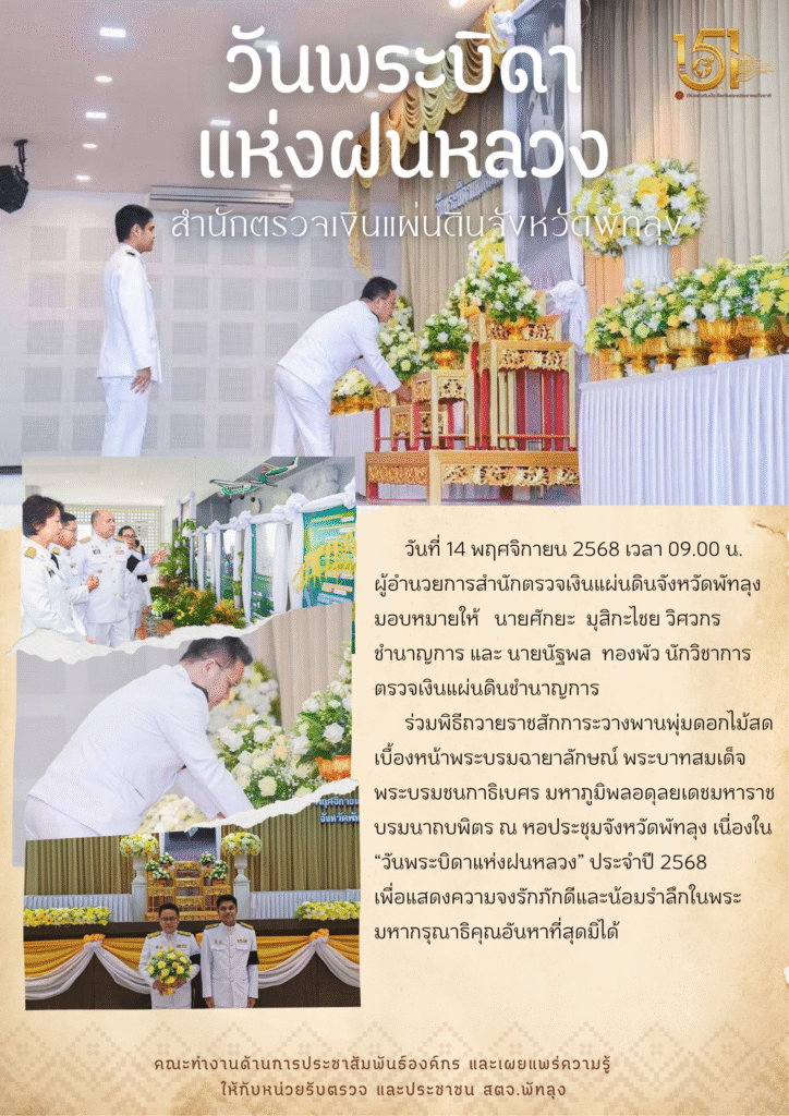สตจ.พัทลุง ร่วมพิธีถวายราชสักการะวางพานพุ่มดอกไม้สด เบื้องหน้าพระบรมฉายาลักษณ์ พระบาทสมเด็จพระบรมชนกาธิเบศร มหาภูมิพลอดุลยเดชมหาราช บรมนาถบพิตร ณ หอประชุมจังหวัดพัทลุง เนื่องใน “วันพระบิดาแห่งฝนหลวง” ประจำปี 2568กิจกรรมประชาสัมพันธ์, ข่าวที่น่าสนใจ, ข่าวประชาสัมพันธ์, งานราชพิธี/รัฐพิธี, ภาพกิจกรรม, อินโฟกราฟิกพฤศจิกายน 14, 2025พฤศจิกายน 14, 2025 Post Views: 98